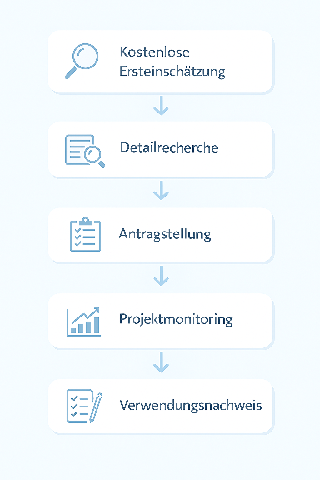 Wir begleiten Sie zuverlässig und zielgerichtet durch den gesamten Förderprozess – von der Idee bis zur erfolgreichen Abwicklung.
